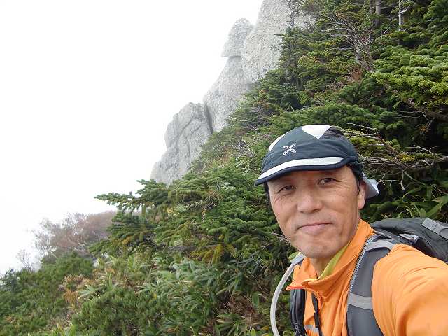 10:24 ガスが猫又山を包んでいます。山頂手前の大岩を通過。もう少しで頂上です。