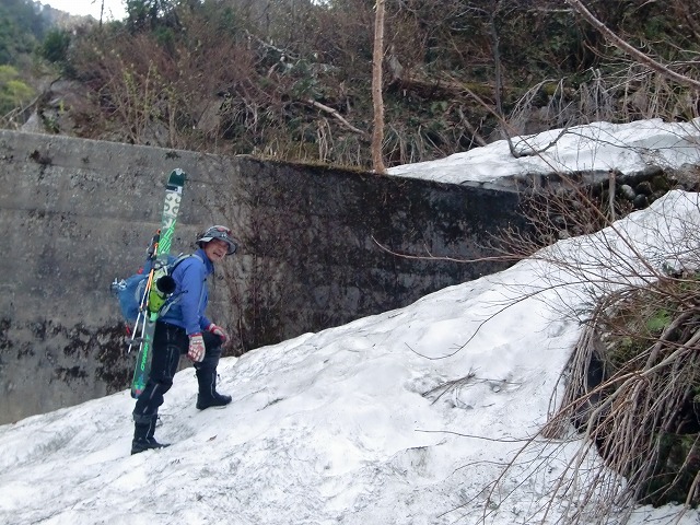 10時07分 最終堰堤到着。 デブリに苦労しながらどうにか滑降終了。