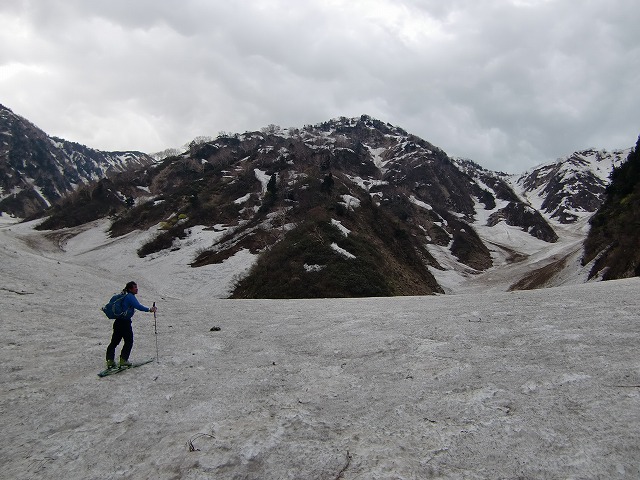 5時25分 最終堰堤上部からスキーで登行開始。 昨年落盤事故で作業員が亡くなった場所です。手を合わせました。