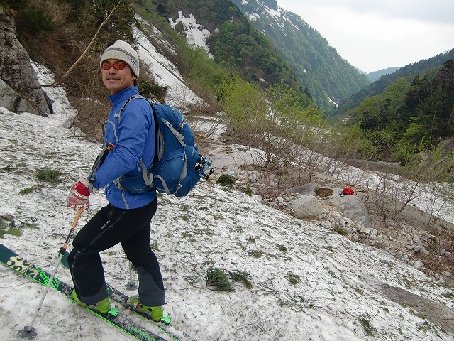 5時50分 大明神沢の分岐点に到着。左に入ります。 デブリはひどいのですが快調にシールで進みます。