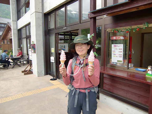 野いちごのソフトクリームに感激です。 今日は、 計5時間の歩きです。