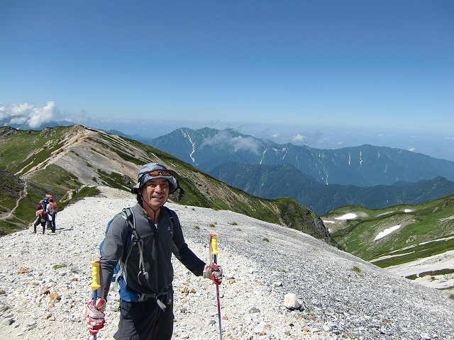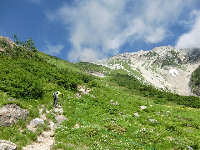 9:18 炎天下の中 苦しい登りです。気温が20度以上あり、これまでの登山の中で一番の気温です。剣岳の登りよりつらく感じます。ガンバ!