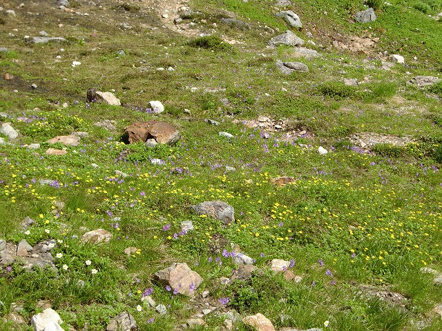 素晴らしい「お花畑」が続きます。チングルマの白 キンポウゲの黄色 ハクサンコザクラの紫 等色とりどりの花が咲き乱れています。