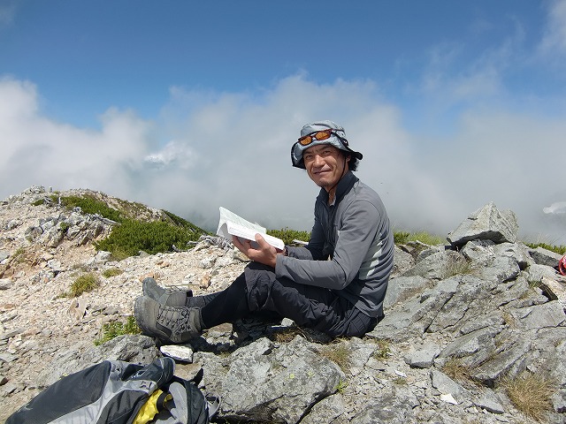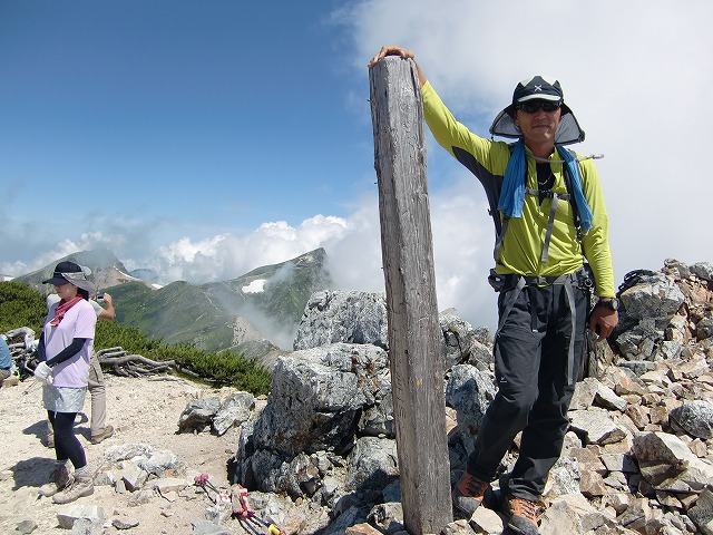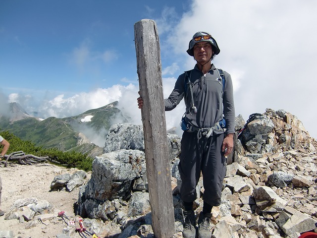 10:57 鑓ヶ岳頂上到着。バックに白馬岳がちらりと見えました。