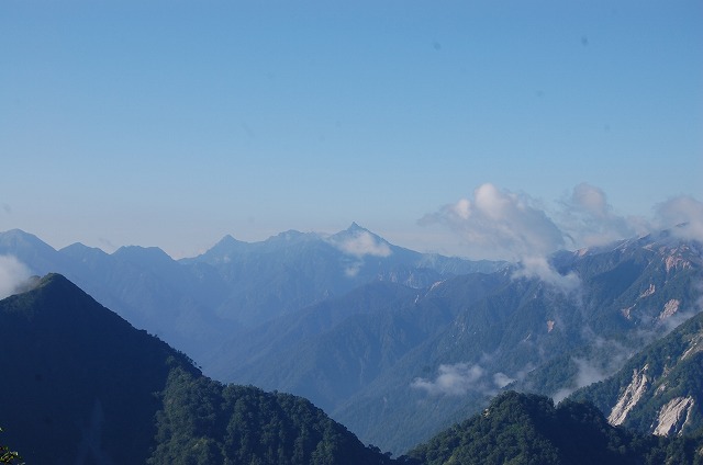 「針ノ木岳」の下には黒四ダムが見えます。黒四をはさんで「雄山」の反対側に位置する山です。しかし、頂上には雲が。「剣岳」にも雲の帽子が。残念