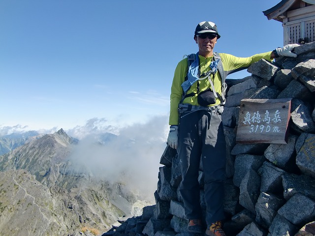 9:35 奥穂高岳山頂到着 最高の天気に大満足です。 「槍ヶ岳」もしっかり見えます。次は槍を目指しましょう。