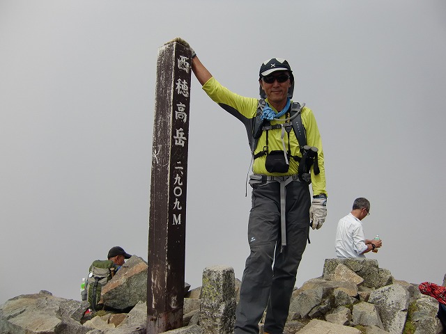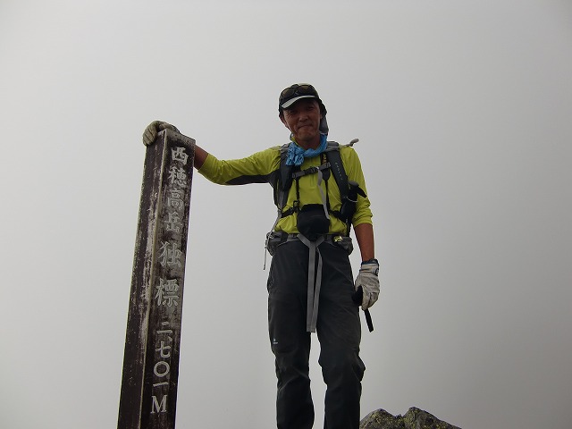 13:25 西穂高岳山頂到着 やっとたどり着きました。13時が過ぎおきまりの雲が山頂を覆ってきます。西穂高岳からの眺めは諦め、先を急ぎます。