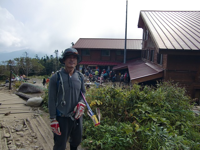 14:44 西穂高岳山荘到着(駆け下りてホット安心)
