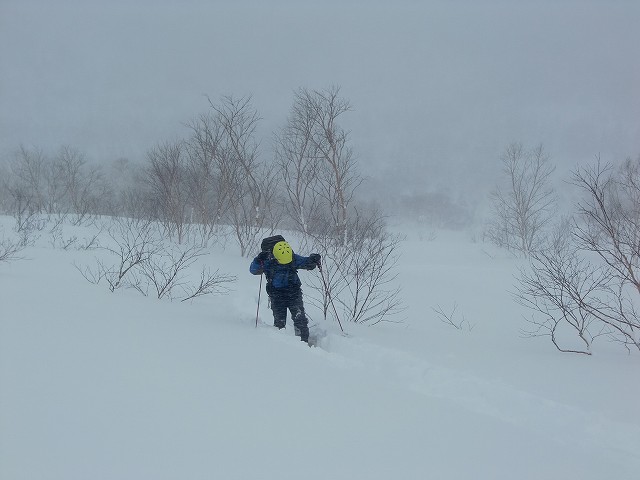 12:32 早稲田大学小屋横を通過。まだまだ雪が少ないので、林の中を枝を避けて滑ります。