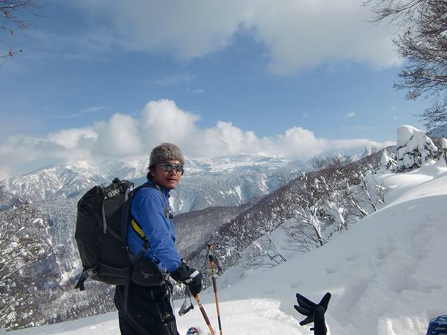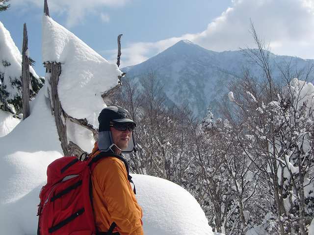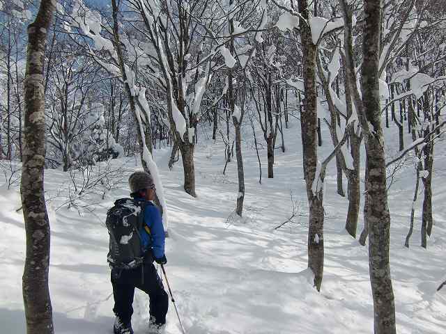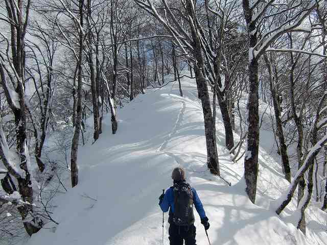 先行していた登山者(パーティー)に追いつき、その後は私たちが先頭でラッセルをするはめに。ここでも「天狗蔵」君が大活躍。どんどん前に進んでいきます。深雪・急斜面でのスイッチバックがなかなか難しく、苦労しました。