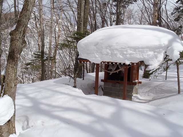 12:23 標高1400m地点尾根途中の神社通過(魅力的斜面に我慢できず滑降)