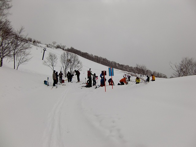 3名のテレマーカーが、これから滑るところでした。登り返して何本か滑ったようです。