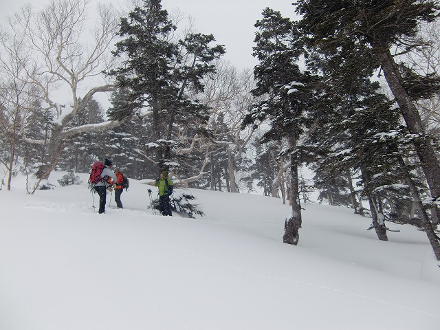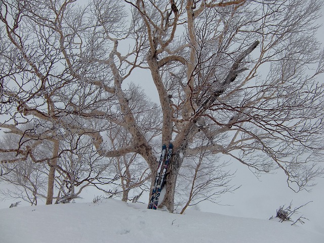 「鵯」の最初にでくわす大きな「ダテカンバ」? スキーと比べると太さがわかります。