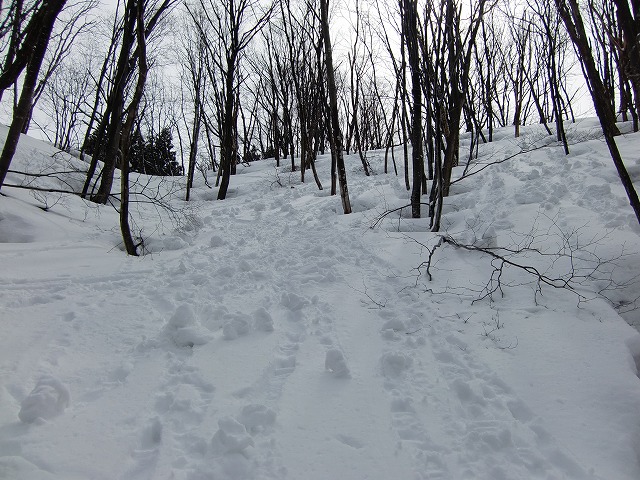 取り付き尾根に突き当たりましたが、すぐには尾根に取り付かず、右の谷を滑ってきた跡に添ってハイクしていきます。