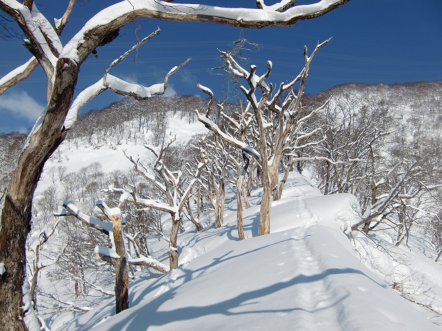 細い尾根に出ました。ここの木は、みんな枯れています。