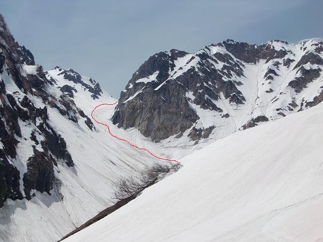 今回の滑降ライン。右上に杓子岳の壁があり、そこからの落石が心配でした。