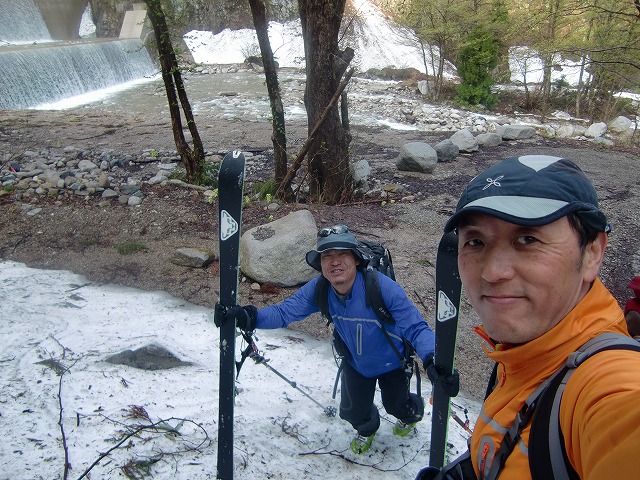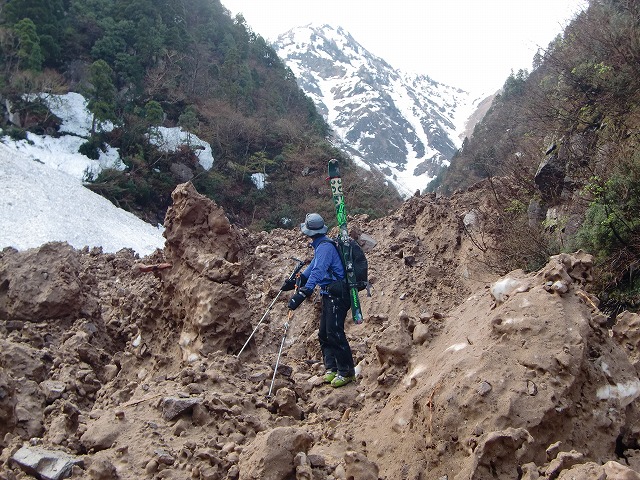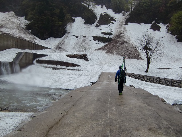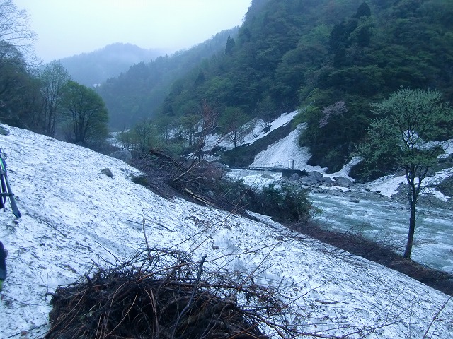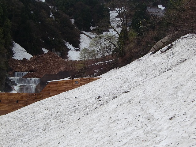 6:45 阿部木谷最終堰堤到着。 よく見ると土砂と雪が混じり合っています。