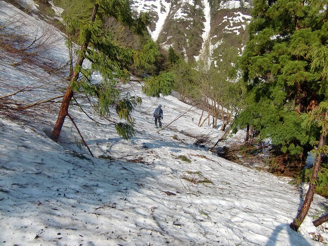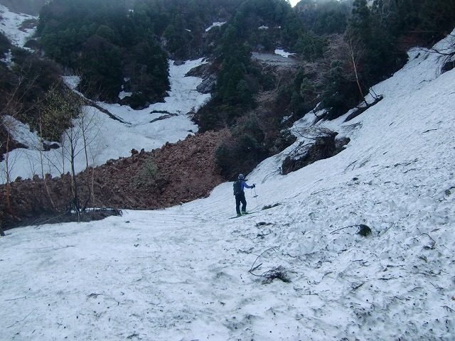 大明神沢の上部に大きな「底雪崩」の跡が見えます。