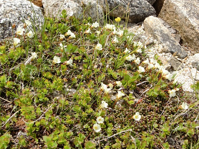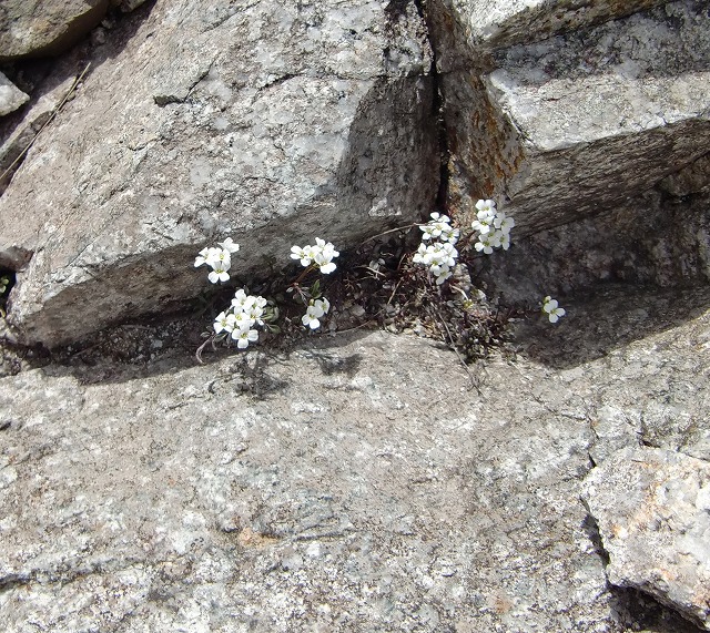 下りは、高山植物の写真を撮りながらのんびりムード。最初に出逢った、白い小さな花「ウメハタザオ」だと思うのですが。