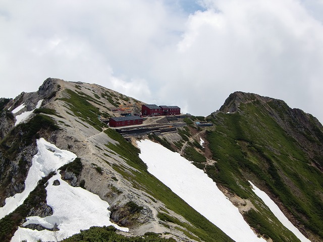 唐松岳の登り 振り返ると山の稜線から少し下がった所に山荘が建てられています。