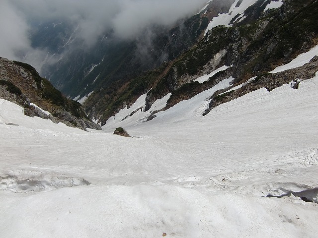 Dルンゼの上部まで移動。下を覗いてみました。斜度40度から35度が下まで続いています。