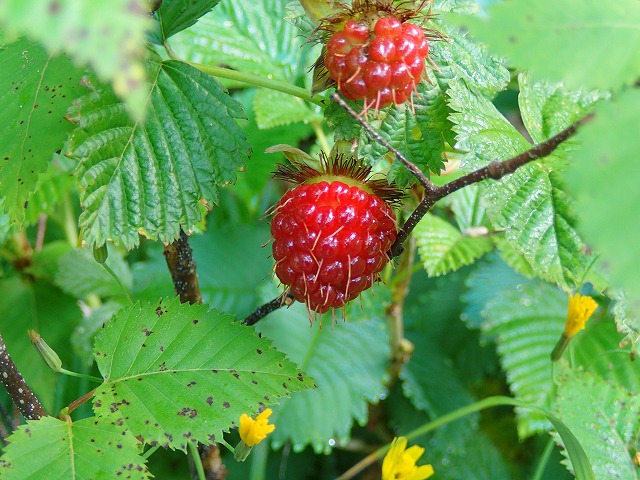 「ベニバナイチゴ」の実が美味しそうになっていますが、写真だけで我慢。