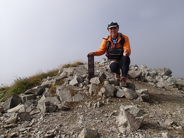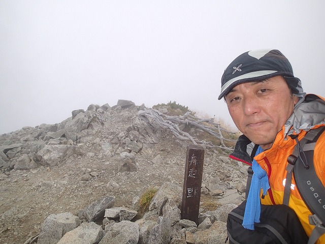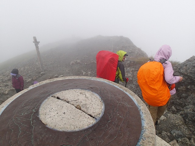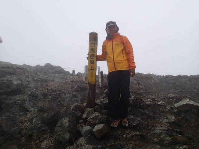 9:58 白馬岳山頂到着 寒さに耐えきれず、雨具を着用。山頂は、強風と小雨で最悪です。