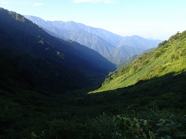ブナクラ谷に朝日が照り始めます。気温上昇が気になります。このあたりから急勾配の連続。