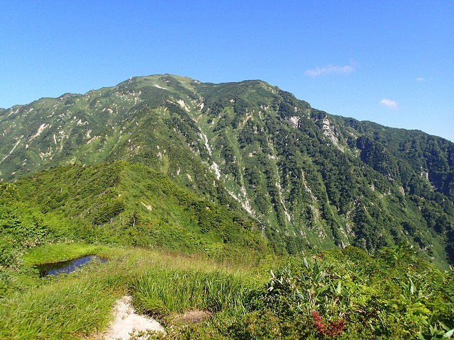 池塘と猫又岳 猫又山頂からの「南東ルンゼ」がしっかり見えます。昨年はここを滑って、折尾谷まで下り、ブナクラ峠に登り返しました。結構な斜度があるではありませんか。