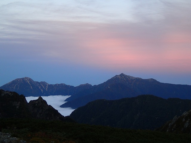 鹿島槍ヶ岳がきれいに見えます。その左が五竜岳。山にも夜の帳が下りようとしています。