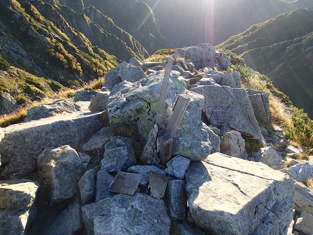 7:53 剱岳山頂到着。やっぱり祠がないと間抜けな感じです。看板だけが残されていました。