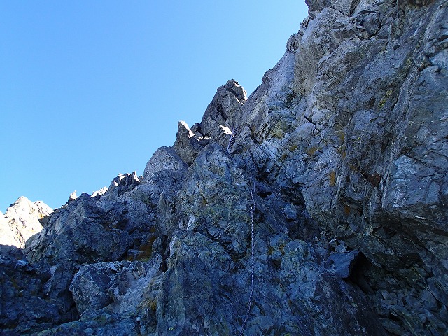 確かに。ロッククライミングの技術がなければ、無理なところです。高度感があり、「怖い」と感じて鎖にしがみつけばつくほど、滑りやすくなるでしょう。