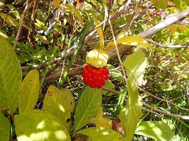 熟した「ベニバナイチゴ」の実を口の中に入れてしまいました。これは、ヤバい。美味すぎ。この時期、葉っぱが黄色くなった実でなけれがならないことが分かりました。