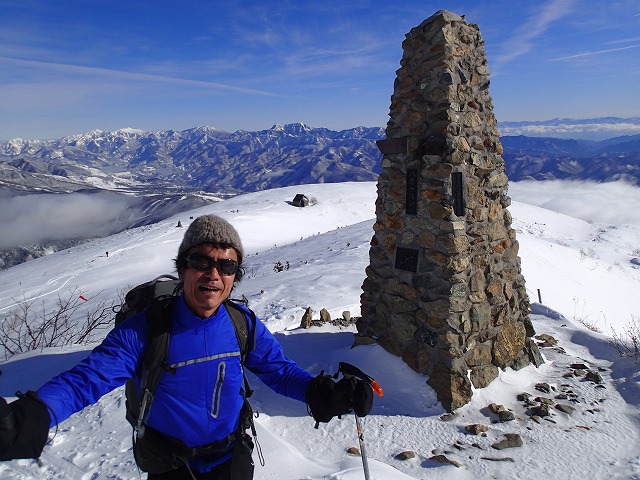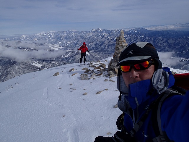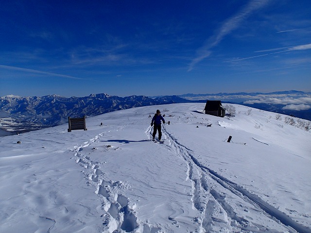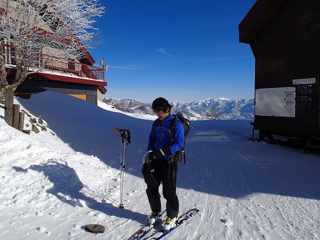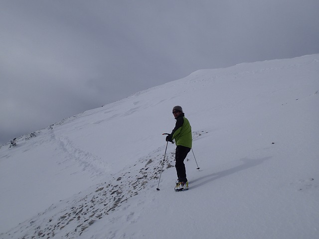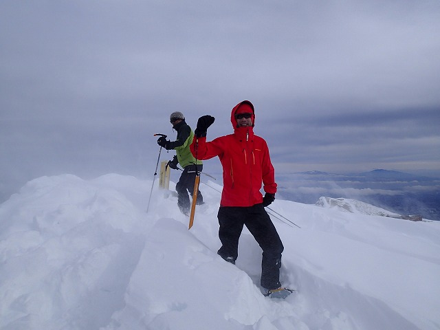 山荘の脇にスキー・リュックをデポして山頂に向かいます。強風で体感温度は、マイナス15度ほどではないでしょうか。