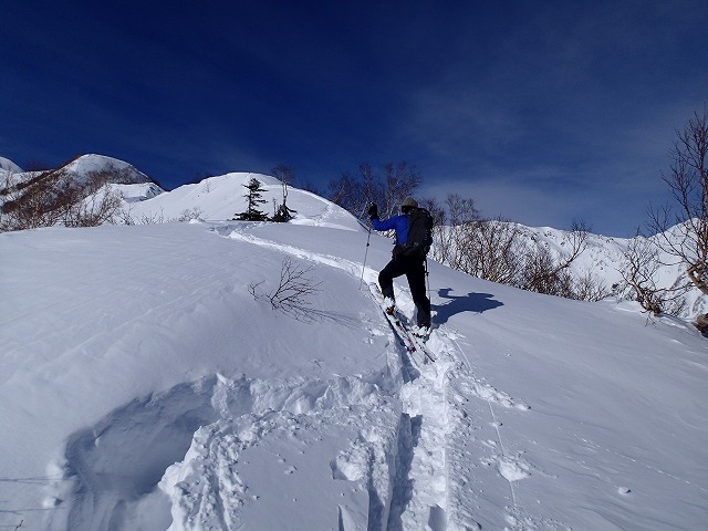深雪が現れます。トレースが有りますが、斜度が急になったところで終わり。どこかの沢に滑りに行ってしまいました。