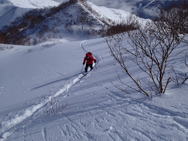 ぴくぴく痙攣も来ています。柔らかい雪を探して下っていきました。