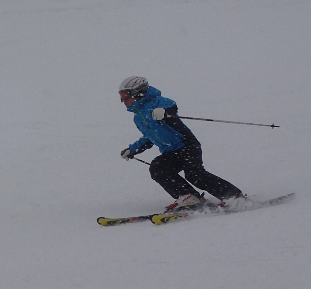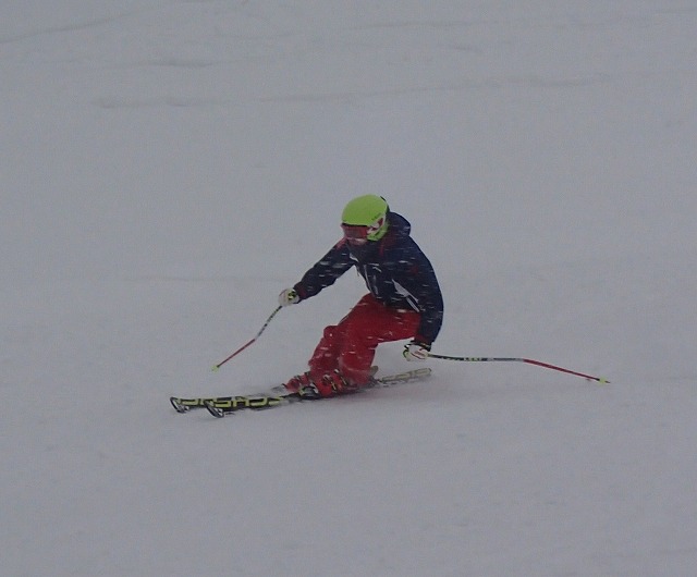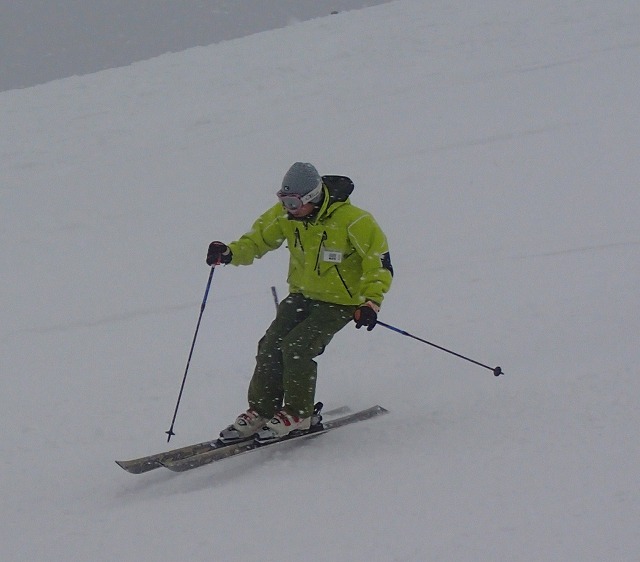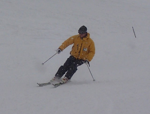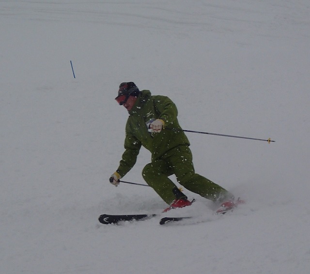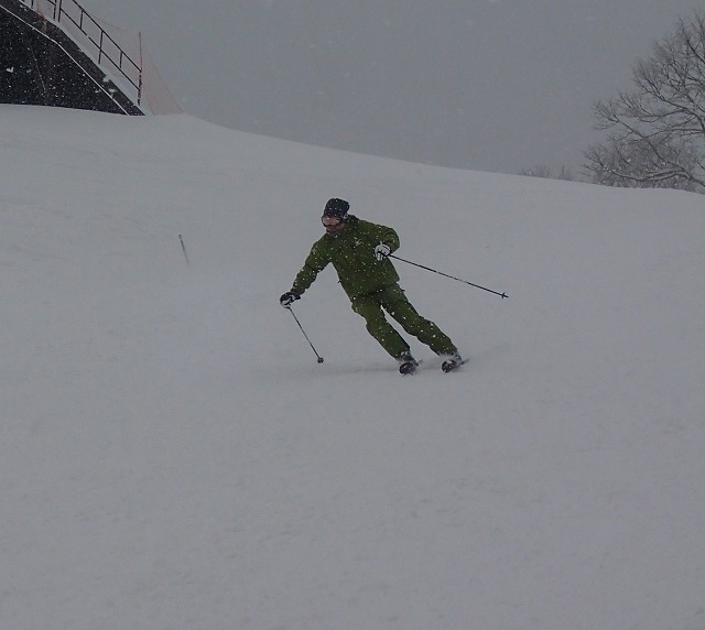 雪煙があがりません。柔らかく雪面をとらえ、高い姿勢で滑っています。