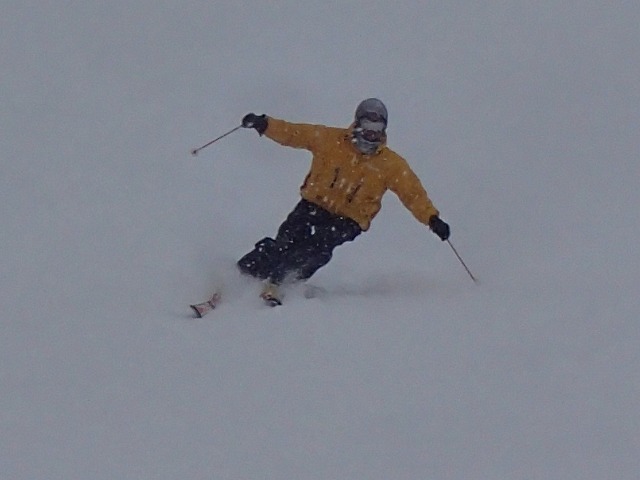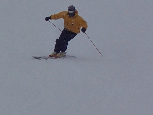 栂池に到着してみると、あまりの気温の低さに、雪はサラサラで新雪20cmはあるのですが、全く気になりません。下に硬い斜面が残っており、ハイスピードでの練習ができました。