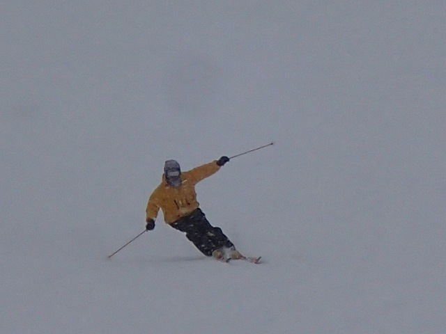 経理部長の苦手なターン。谷スキーに荷重はされています。もう少し外スキーを伸ばし、長い軸を作りたいところ。