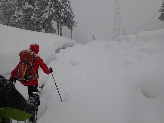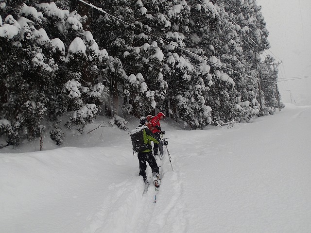 12:04 トレースを見失いやむなく林道に(林道をラッセルで移動)