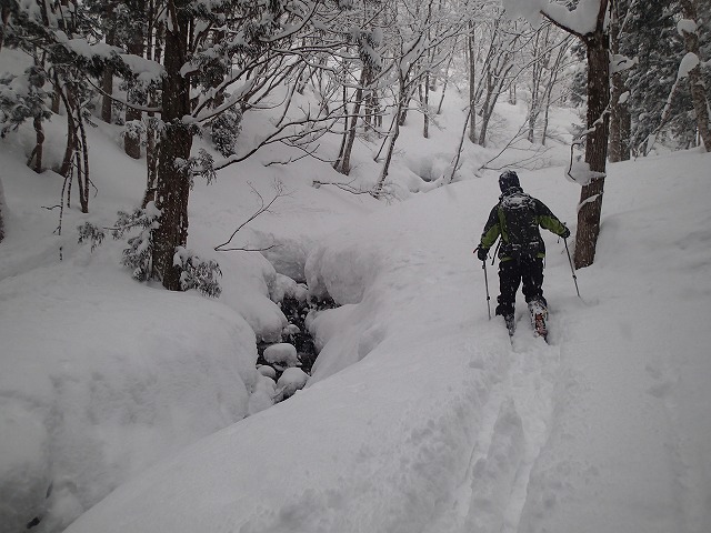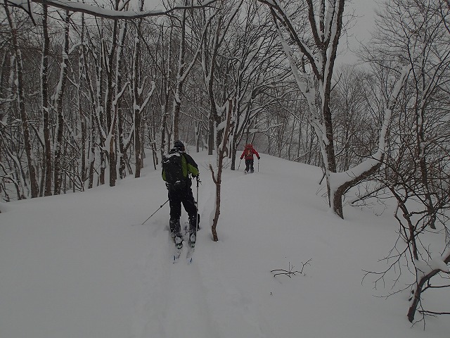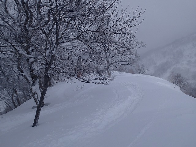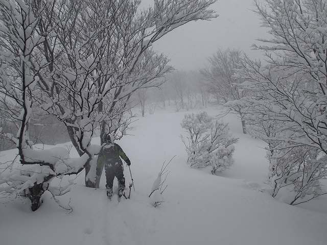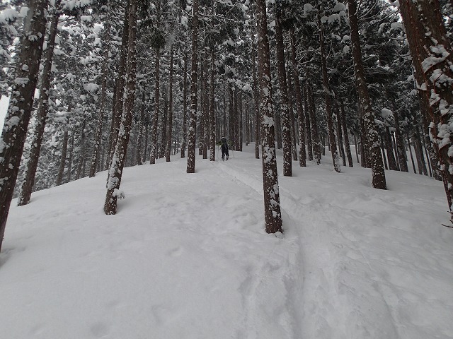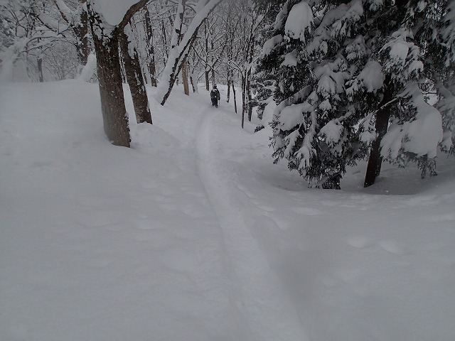 第三林道から谷間に滑降していくコースは、樹木が適度な間隔であるため、滑降しやすい斜面となっています。