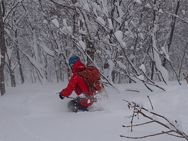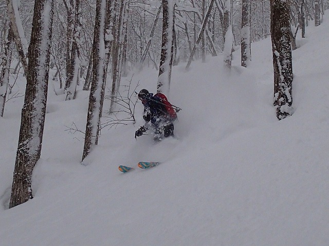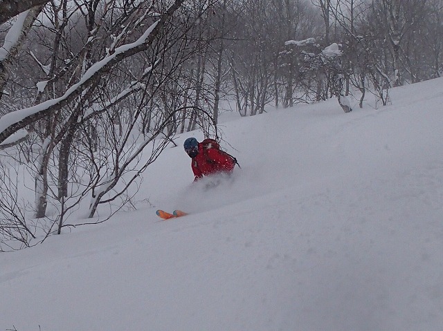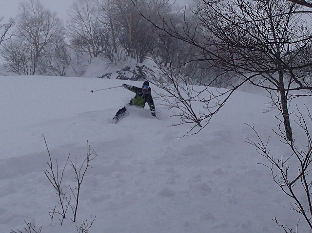 菅平での硬く絞まった雪の滑降もスピード感があって楽しいのですが、激パウもたまりません。