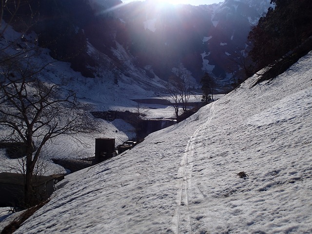 8:17 大明神沢出合通過。ここから太陽がまぶしくなります。雪も緩んできました。