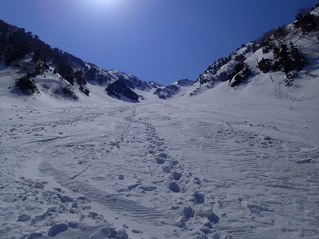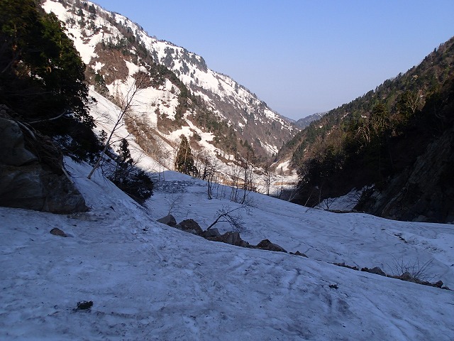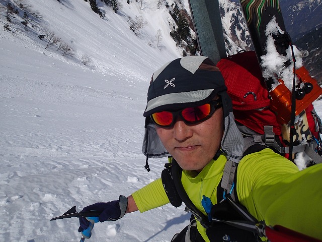 大明神沢出合からは、雪が腐ってブレーキがかかってしまいます。とにかく直滑降で行くのみ。