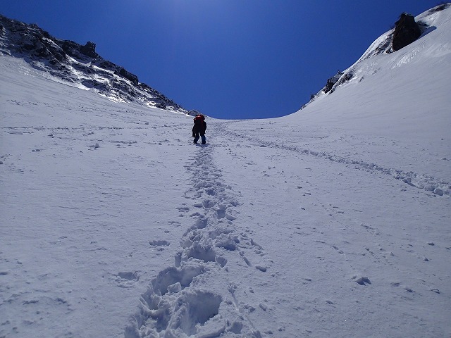 さすがに、アイゼンを付けてからの1時間は、久々に辛く感じました。急斜面に足場がしっかりせず、慎重な登りが要求されました。