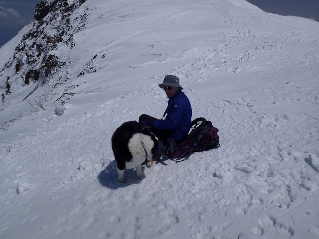 11:30 鞍部に到着。犬が迎えてくれました。登山者と一緒に来たようです。登山犬に初めて会いました。