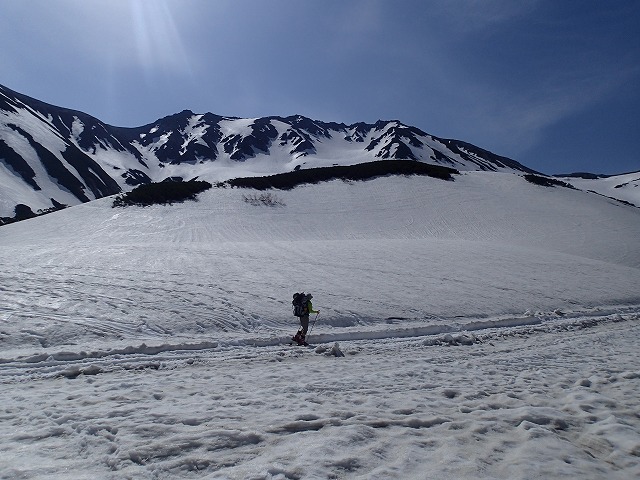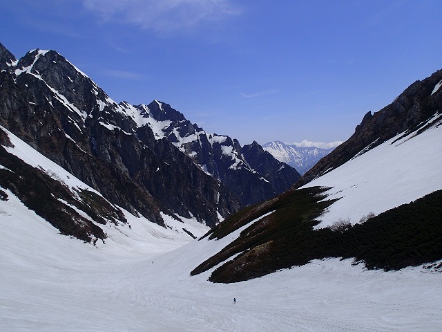 平蔵谷に向かって後半の剱沢。滑りごたえ、眺めとも最高。