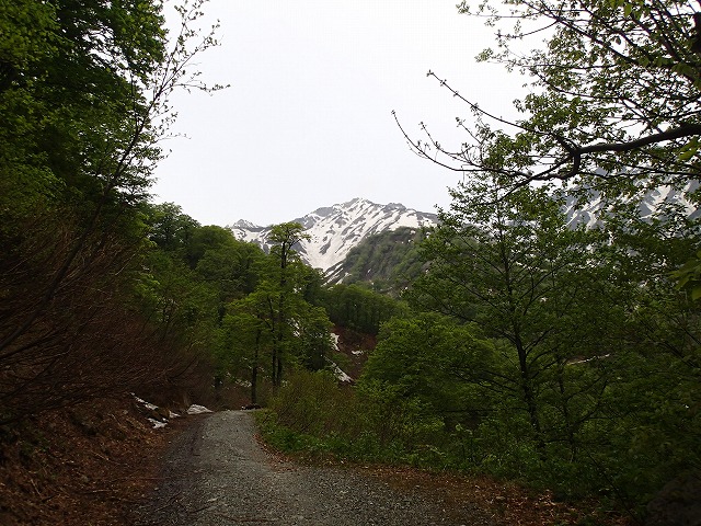 5:57 林道から雪渓に(しばらくは登山靴でハイク)