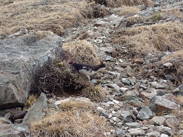 山荘のすぐ上で「雷鳥の番い」に遭遇。オスは目立つ色をしています。