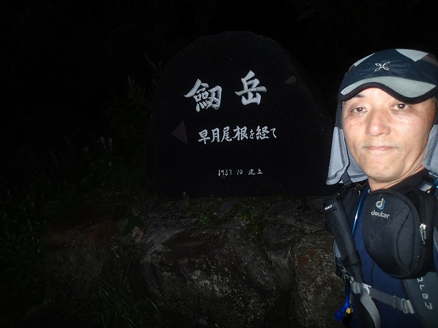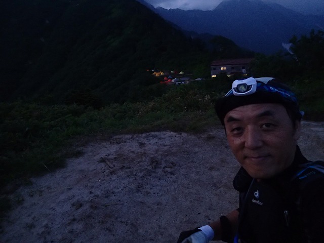 1:20 馬場島スタート 暗闇に世界にヘッドライトのみが頼りです。消してみましたが、全く何も見えません。今回ヘッドライトの代わりの電池を忘れました。ハラハラドキドキの登りです。